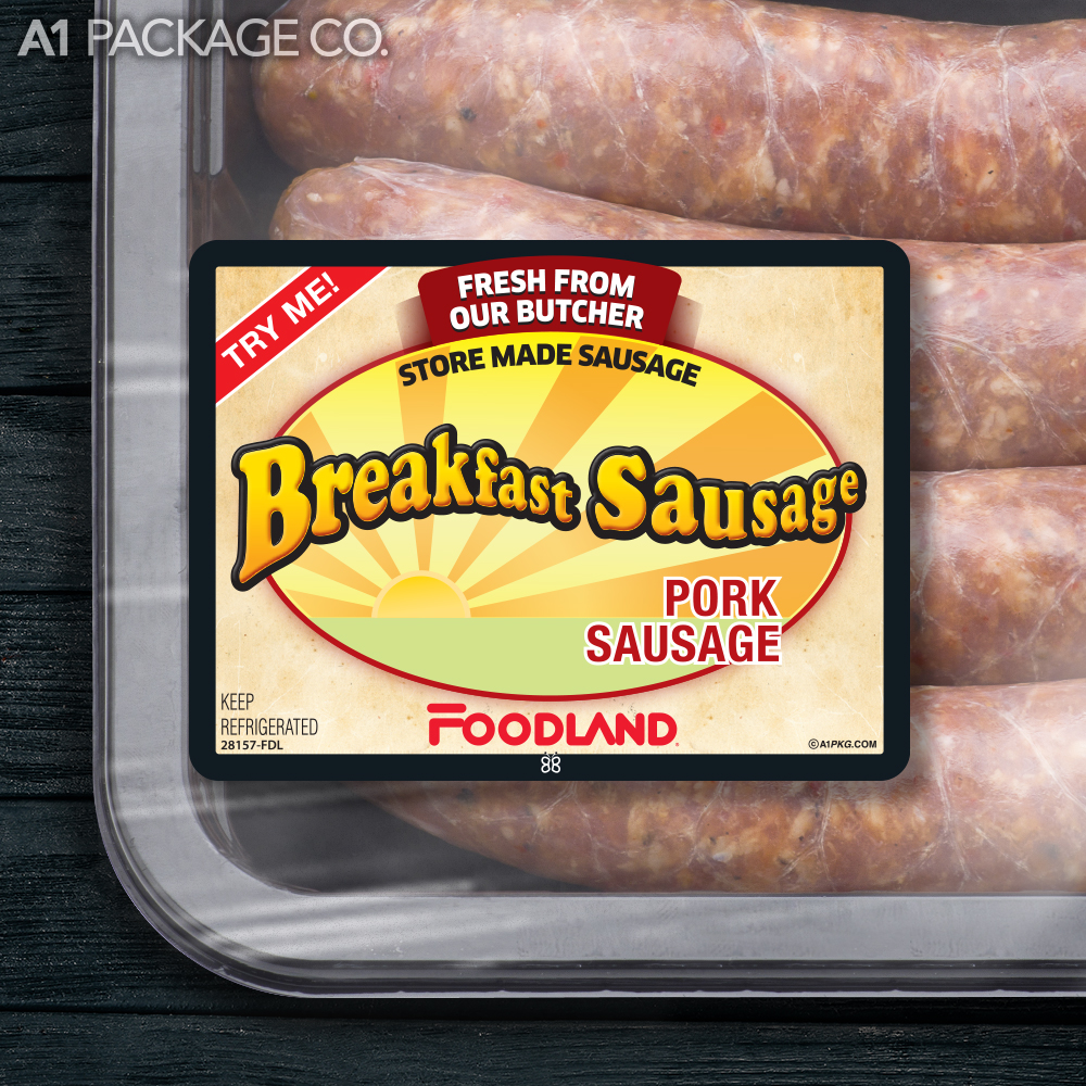 Give your store-made Foodland Breakfast Pork Sausages a professional, brand-name look. These high-quality labels will enhance your product's presentation, attract attention, and drive sales.