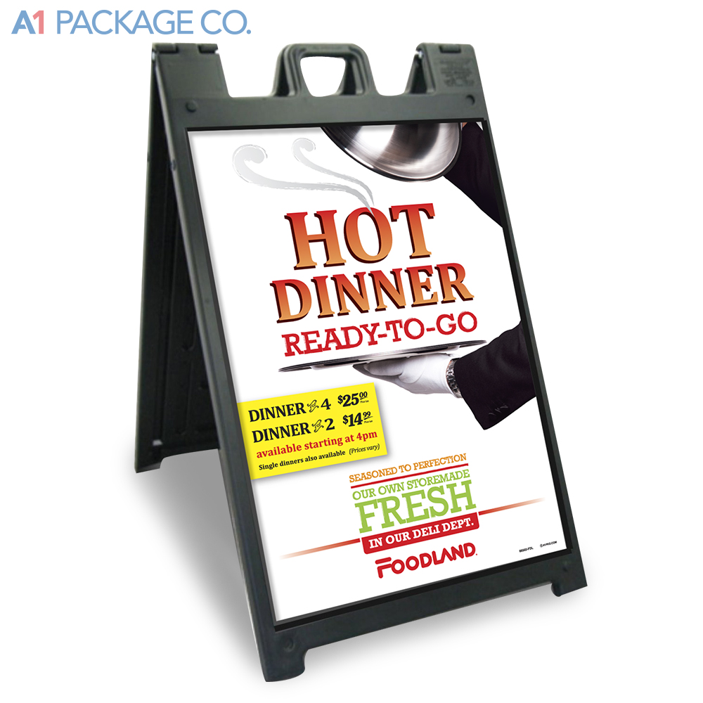 The Foodland Dinner For 4 Ready To Go Signicade Graphic (24"x36") is a vibrant, full-color graphic printed on durable Coroplast material. Designed specifically for use with the Signicade frame, this graphic is perfect for showcasing ready-to-go dinner options for families, boosting in-store visibility, and attracting attention to your special offerings. Each graphic fits seamlessly into the 24"x36" sign area of the Signicade Deluxe (27"x45" frame size).