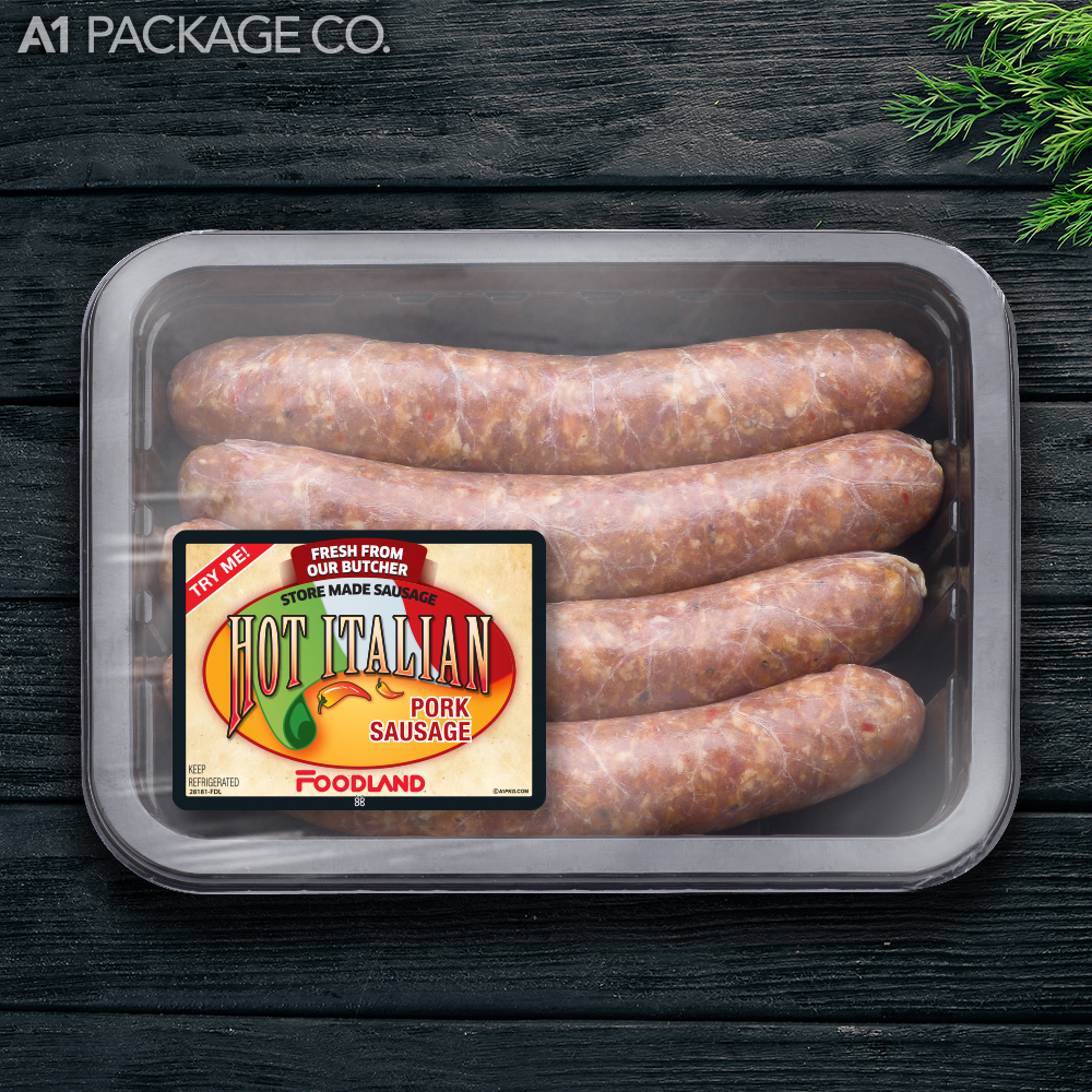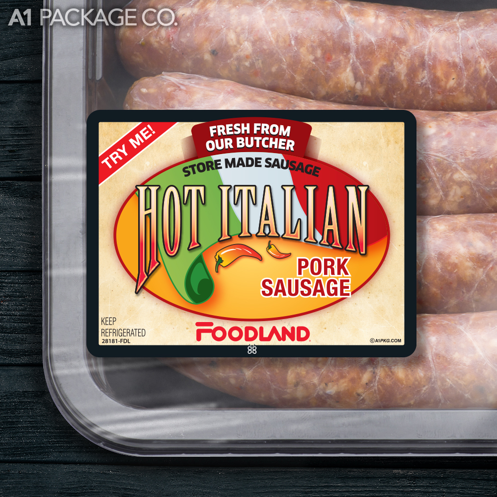 Give your store-made Foodland Hot Italian Pork Sausages a professional, brand-name look. These high-quality labels will enhance your product's presentation, attract attention, and drive sales.